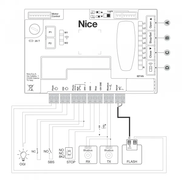 - BlueBUS-Anschluss, der die Zweidrahtverbindung zwischen der Steuereinheit und bis zu 7 Lichtschranken, Steuer-, Sicherheits- und Anzeigegeräten ermöglicht;